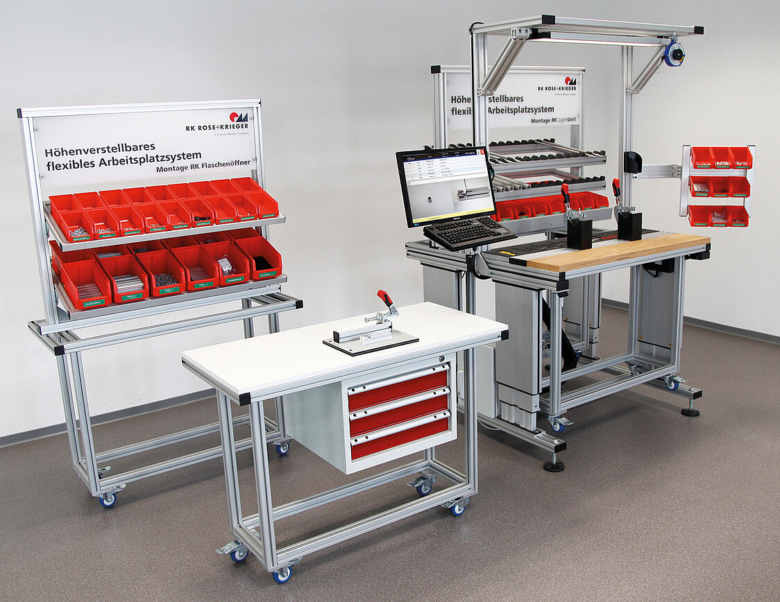 Ein Spezialgebiet von RK Rose+Krieger ist die Gestaltung von Arbeitsplatzsystemen. Sie werden aus Komponenten des gesamten Produktportfolios zusammengestellt. So verfügt das Unternehmen über Aluminiumprofile seines Blocan-Programms, die als Grundgestelle für Montagetische dienen. Mit Bauteilen der Rohrverbindungstechnik lassen sich Monitore oder Bedienelemente anbinden, mit elektrischen Hubsäulen die Höhe von Arbeitstischen und mit Elektrozylindern Griffweiten von Materialkästen variabel anpassen.