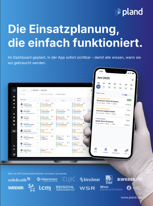 Mit der All-in-One Software von PlanD behalten Gebäudereiniger jederzeit den Überblick. Alle Einsätze und wichtigen Informationen wie Adresse, Uhrzeit oder Aufgaben sind überall für alle in der App sichtbar, und Änderungen erscheinen in Echtzeit. So ist das gesamte Team immer auf dem neuesten Stand. Abwesenheiten lassen sich ganz einfach verwalten und Vertretungen werden automatisch vorgeschlagen, sodass die Planung stets reibungslos läuft. So wissen alle, wer wann wo im Einsatz ist – flexibel, transparent und ohne WhatsApp-Chaos oder Zettelwirtschaft.