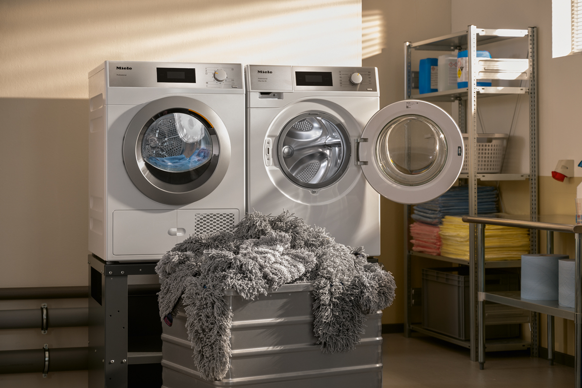 Sie sind Spezialisten für Mopps und Wischtücher: Waschmaschinen und Trockner von Miele, die – je nach Modellreihe – für sechs bis 20 Kilogramm Beladung entwickelt wurden. Gebäudereiniger können sie nicht nur kaufen, sondern auch mieten oder leasen.