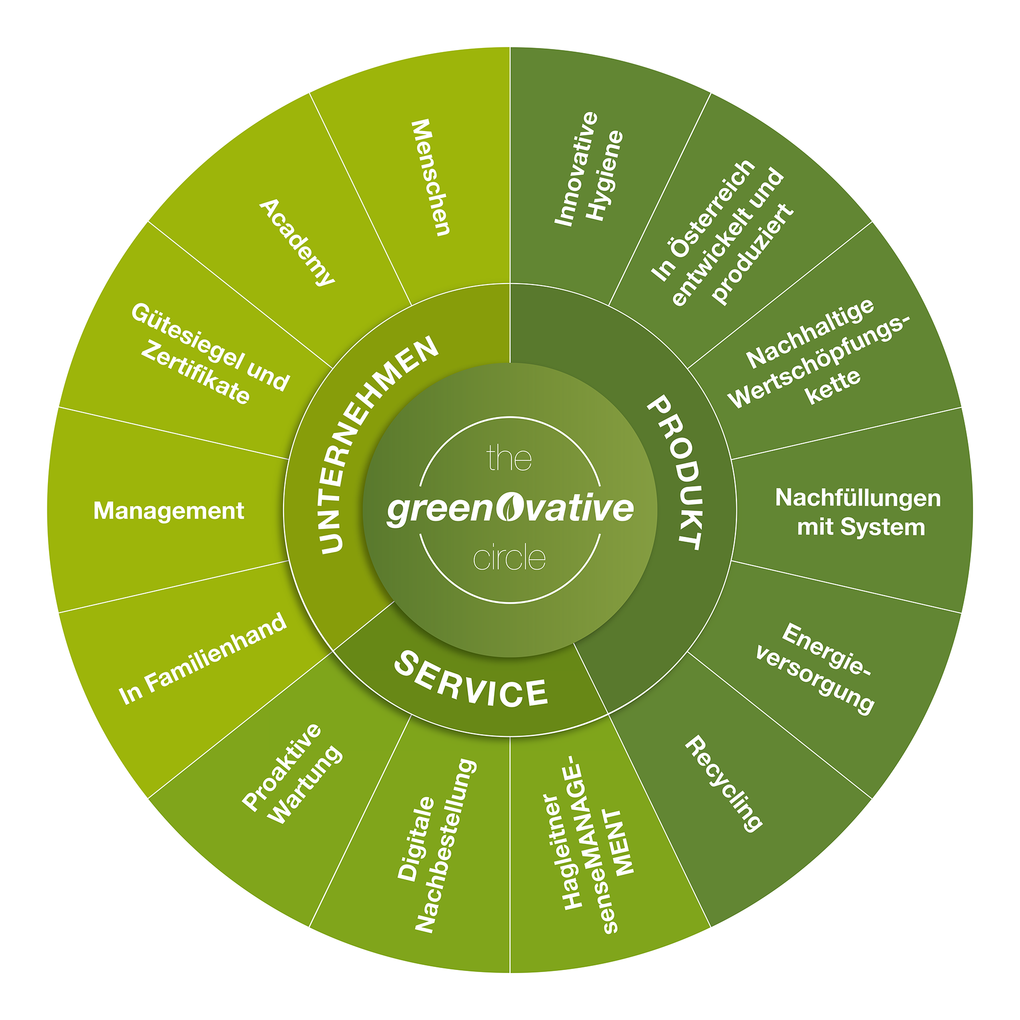Mit Greenovative® by Hagleitner, der Nachhaltigkeitsmarke von Hagleitner, verbindet das Unternehmen Nachhaltigkeit, Digitalisierung und Innovation zu einem ganzheitlichen Ansatz: ökozertifizierte Rohstoffe, Hochkonzentrate, Systemnachfüllungen und Recycling von Kunststoffen. Produziert wird energieeffizient an einem einzigen Standort – in Zell am See (Österreich). Verantwortungsvolles Wirtschaften und technologische Spitzenleistung spielen perfekt zusammen.